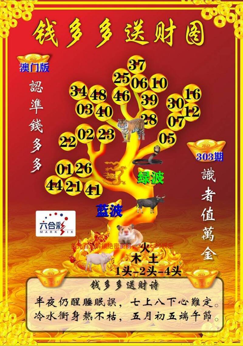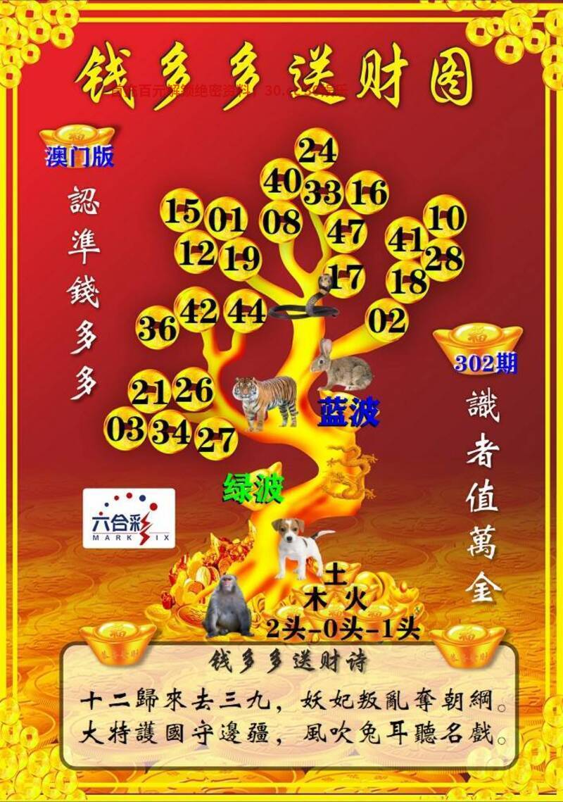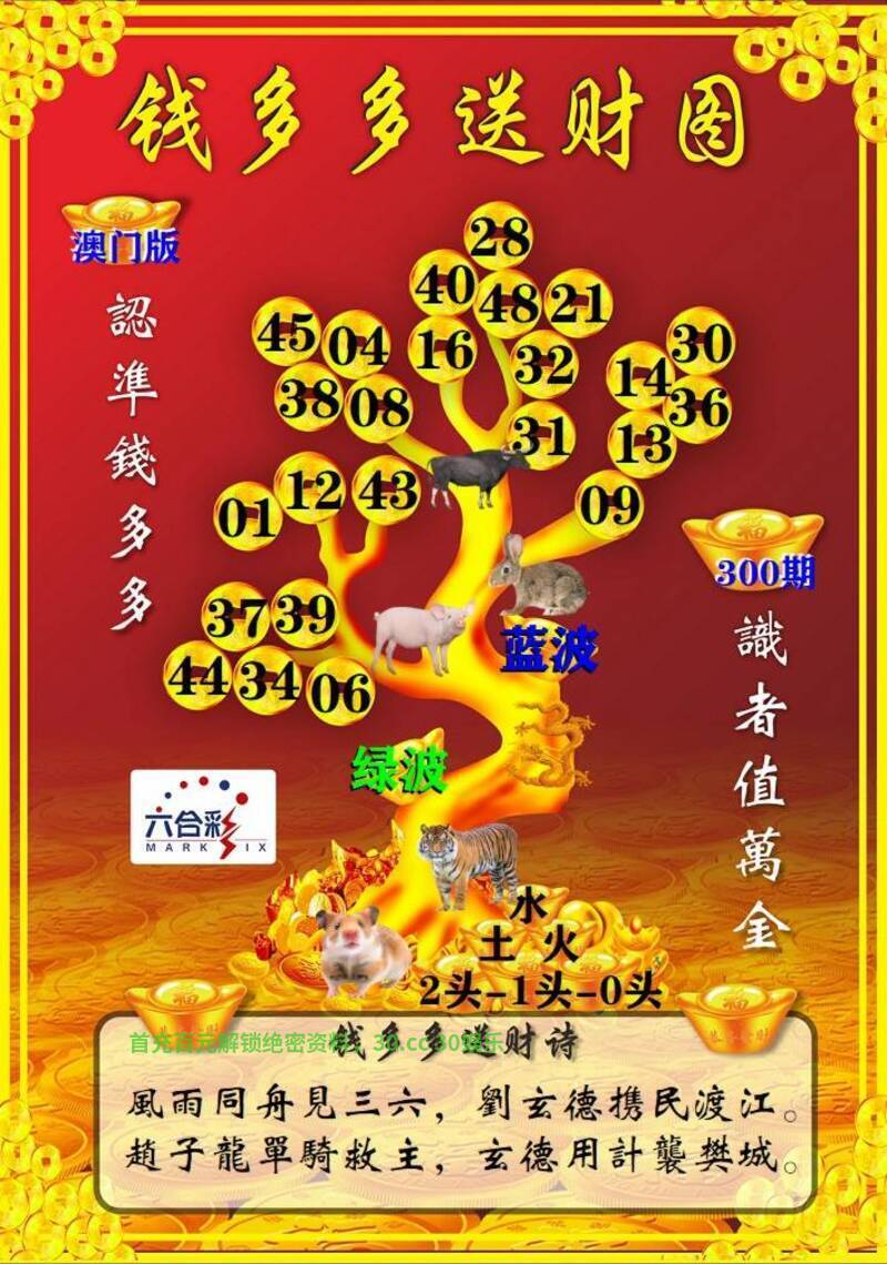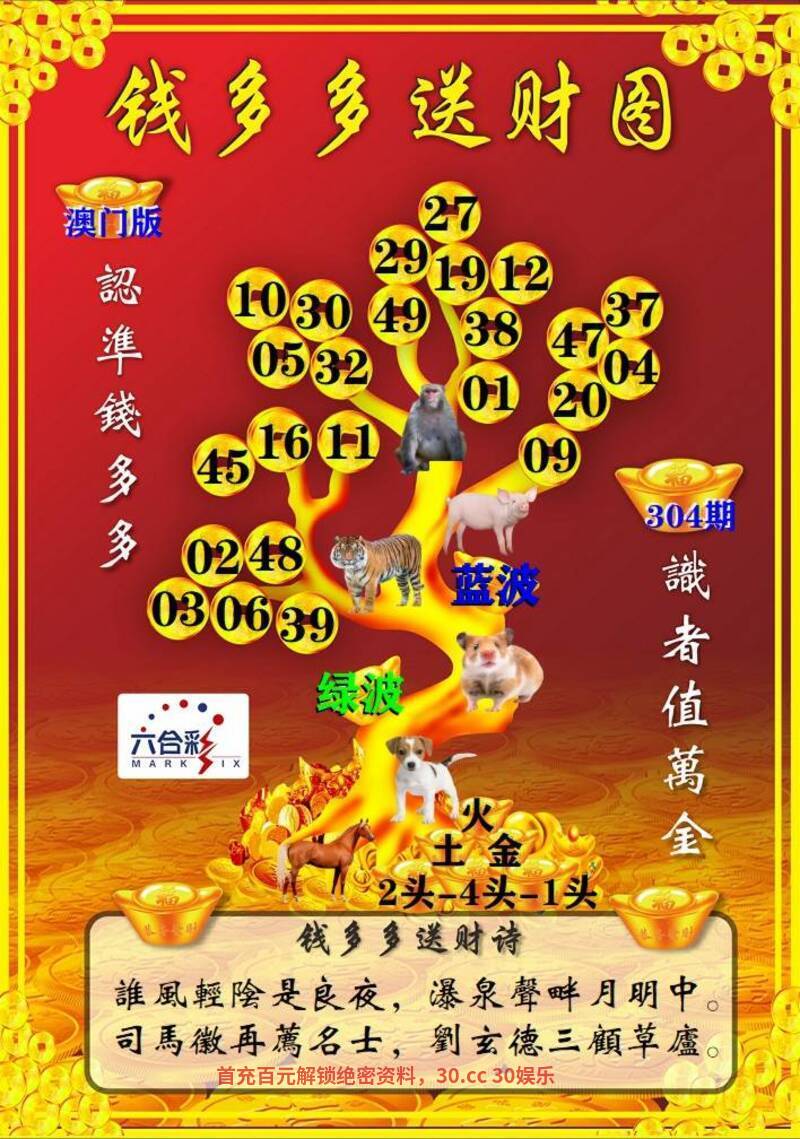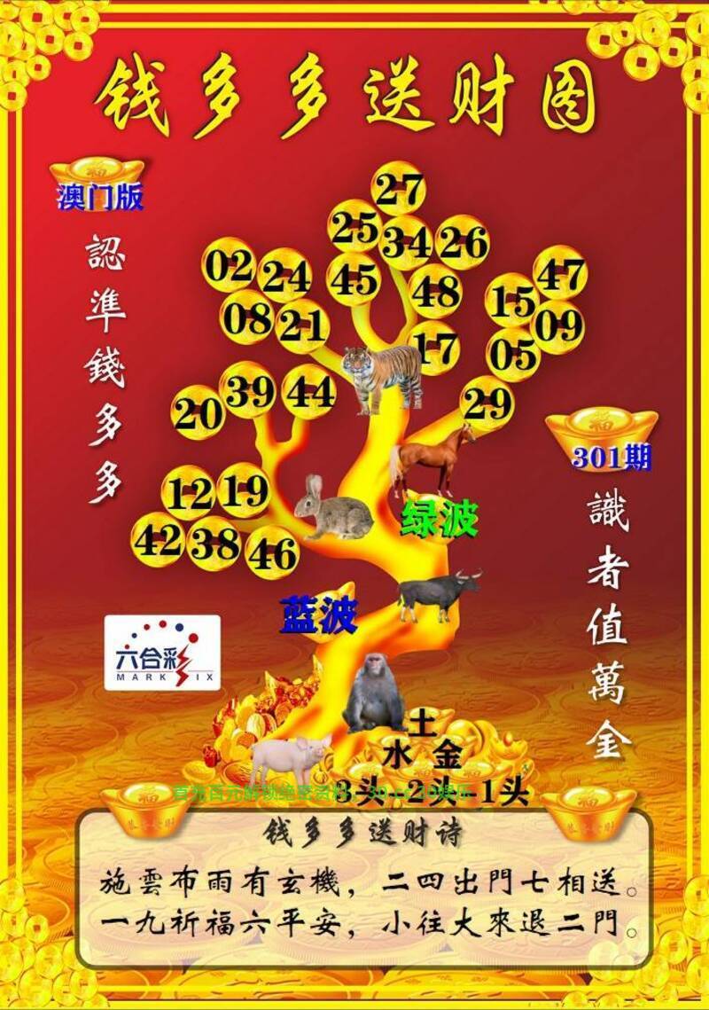 | 301期:【钱多多送财诗】 施云布雨有玄机,二四出门七相送。一九祈福六平安,小往大来退二门。 综合六肖:虎马兔牛猴猪 综合双波:蓝波+绿波 |